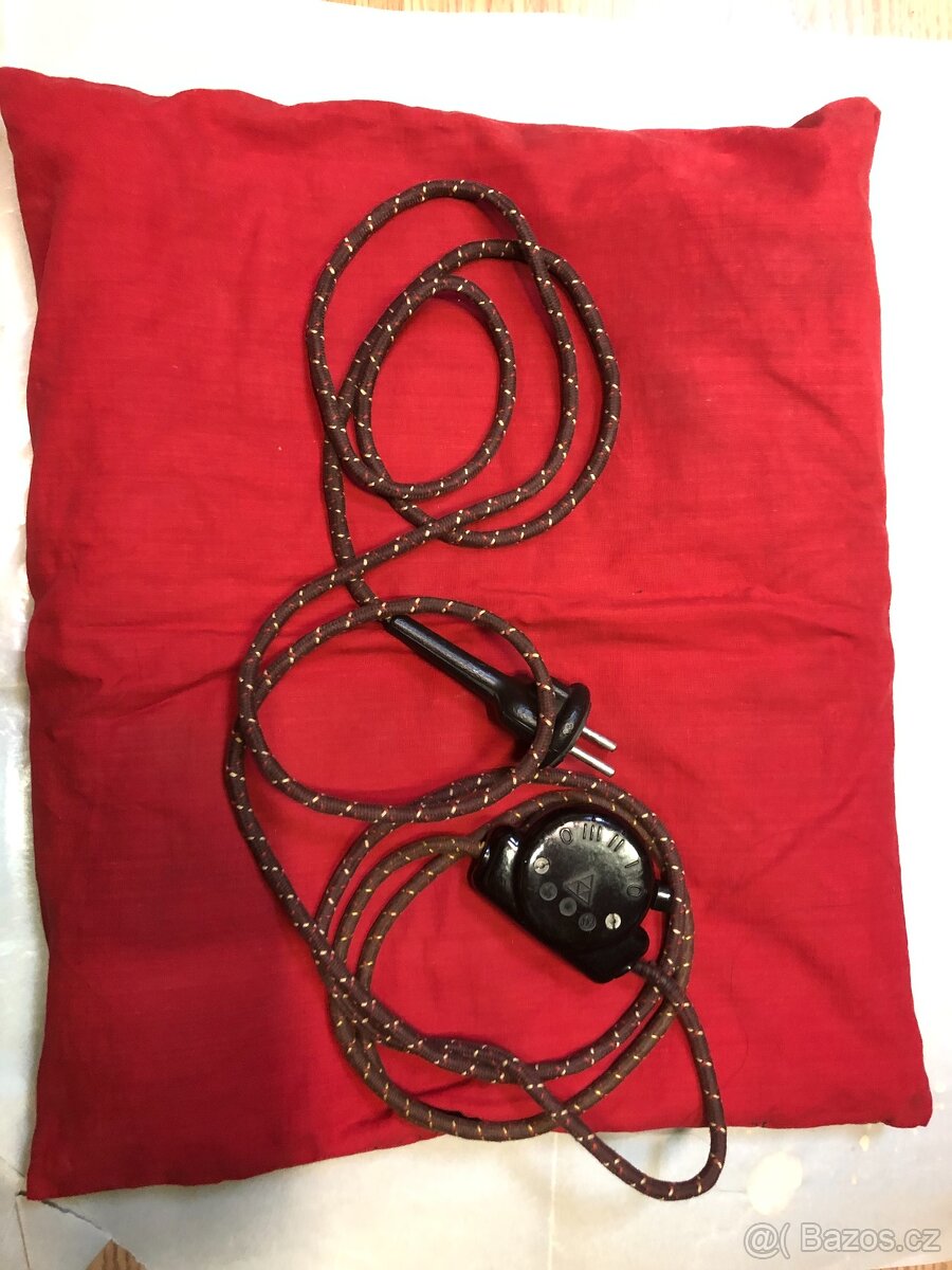 Stará vyhřívací podložka, 40 x 33 cm, 3 stupně vyhřívání, funkčnost z důvodu možného poškození nezkoušena, stav velmi zachovalý, nepoškozený, přívodní opletená šňůra bez známek používání.
