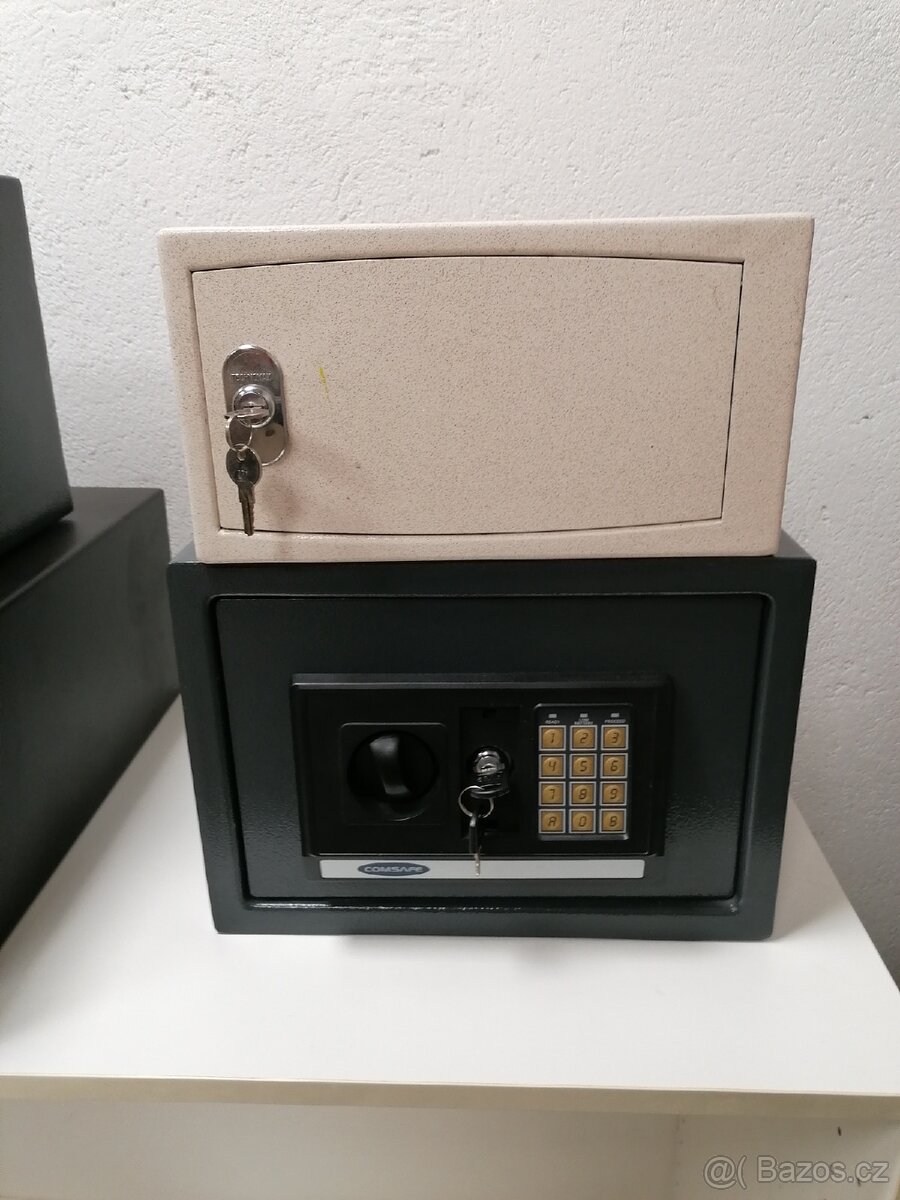 Prodám větší množství trezorů, 8 kusů malý světlý, zámek klíč. š. 31cm h. 28cm v. 17cm. Cena za kus 1000kč. Střední šedý 18 kusů, zámek klíč + kód. š. 35cm h. 28cm v. 25,5cm. Cena 1500kč. Podívejte se na naše ostatní inzeráty. Osobní převzetí, neposíláme.