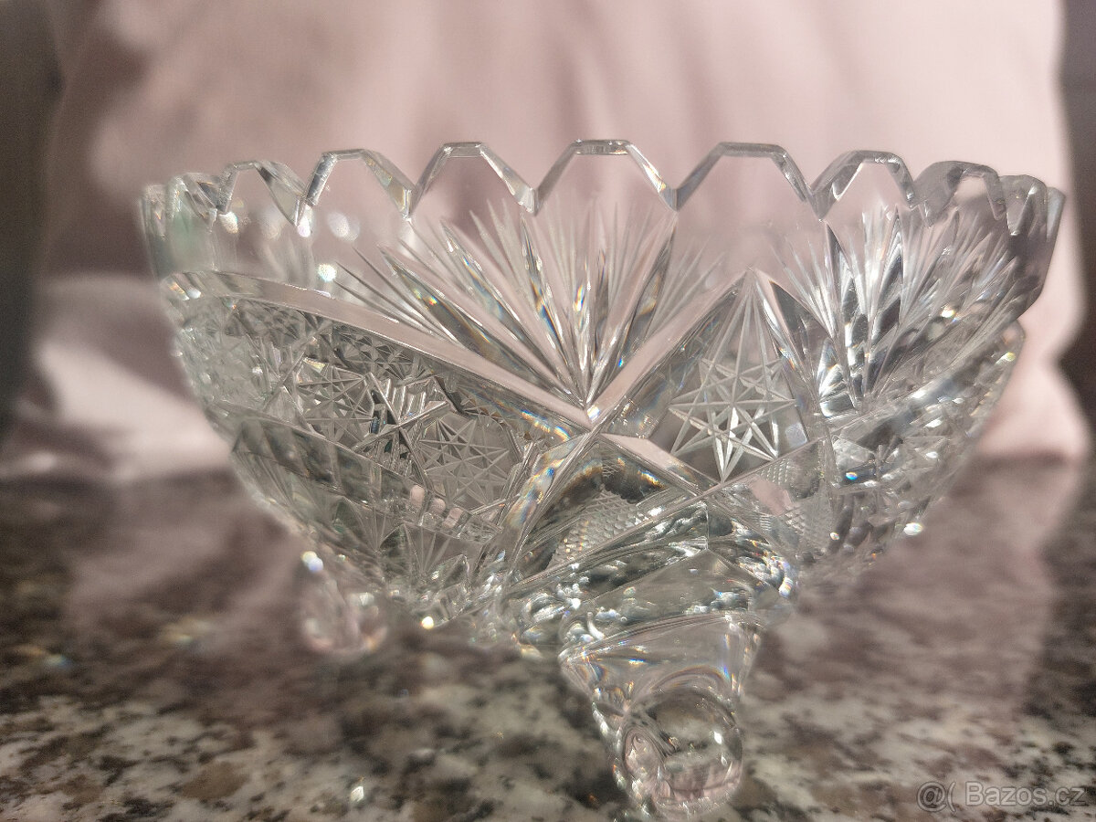 Prodám ručně broušenou křišťálovou mísu na třech nožkách ve výborném stavu.