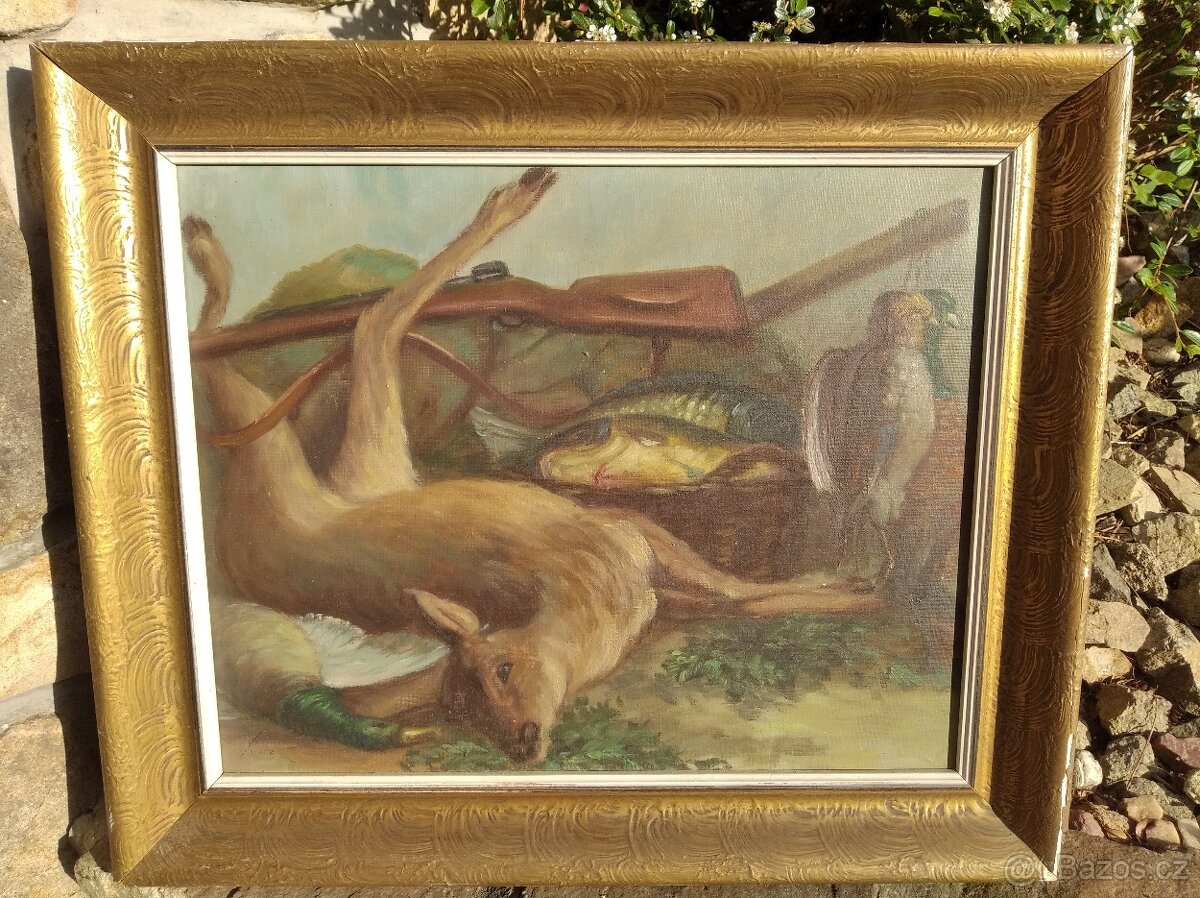 Prodám olejomalbu na plátně s loveckým motivem v rozměru 49x40cm.