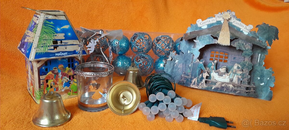 1. Plechový betlém - domeček, na čajovou svíčku (z okýnek září světlo svíčky). Výška - 19 cm, rozměr spodní části - 8,5 ×8,5 cm. Cena - 150KČ.