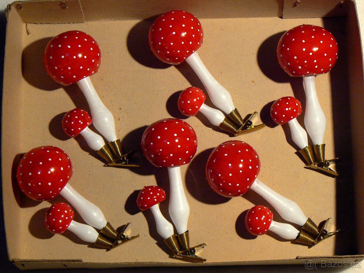 skleněné RETRO vánoční ozdoby-MUCHOMŮRKY-klips-bez poškození, krabička součástí sady