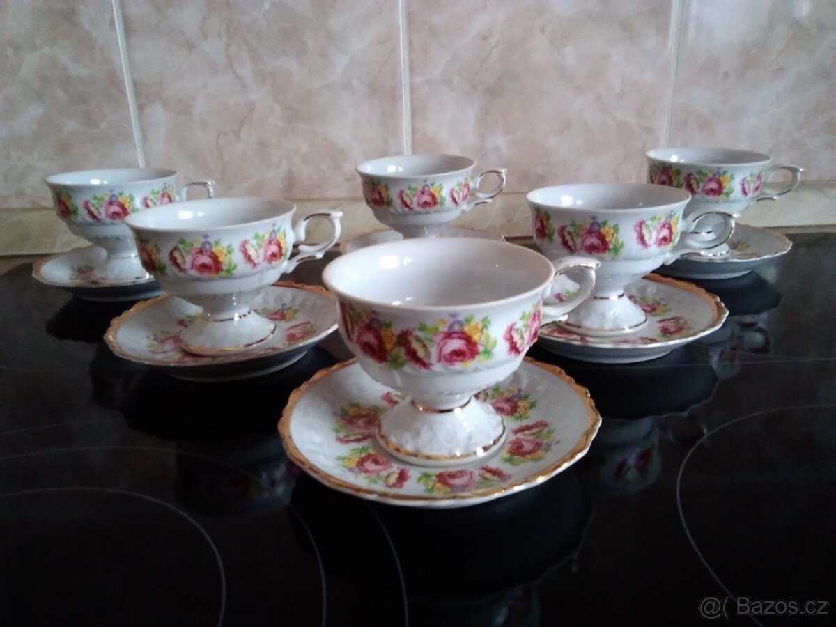 Prodam mocca soupravu 6 dilnou pozlacene okraje prumer talirku 10 cm, prumer hrnicku 7 cm vyska 6 cm obsah 50 ml za 599 Kc