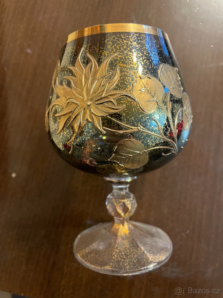 Popis: Jedná se o zdobenou sklenici na brandy s tmavým tělem, které je bohatě zdobené zlaceným a plastickým smaltovaným květinovým motivem.