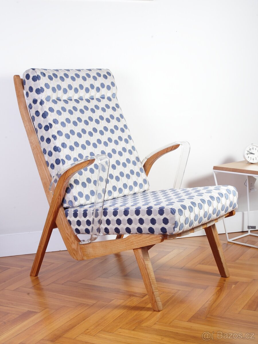 Kompletně zrenovované křeslo pravděpodobně z produkce ULUV ze 60. tých let. Lehká konstrukce z jasanového dřeva, originální /ne repliky/ nepoškozené područky z plexiskla, záslepky šroubů až na jednu originální.