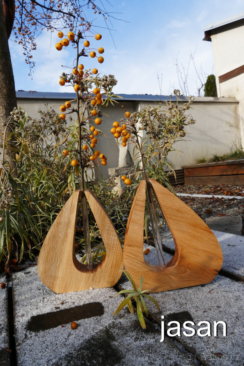 jasanové vázičky- roztomilá vázička na drobné květy, dokonale se vyjímá zejména s lučními květy či větvičkami. Vyrobeno ručně z masivního dřeva, výška 14,16,17cm, napuštěno voňavýmpřírodním olejem. Cena za komplet se zkumavkou.