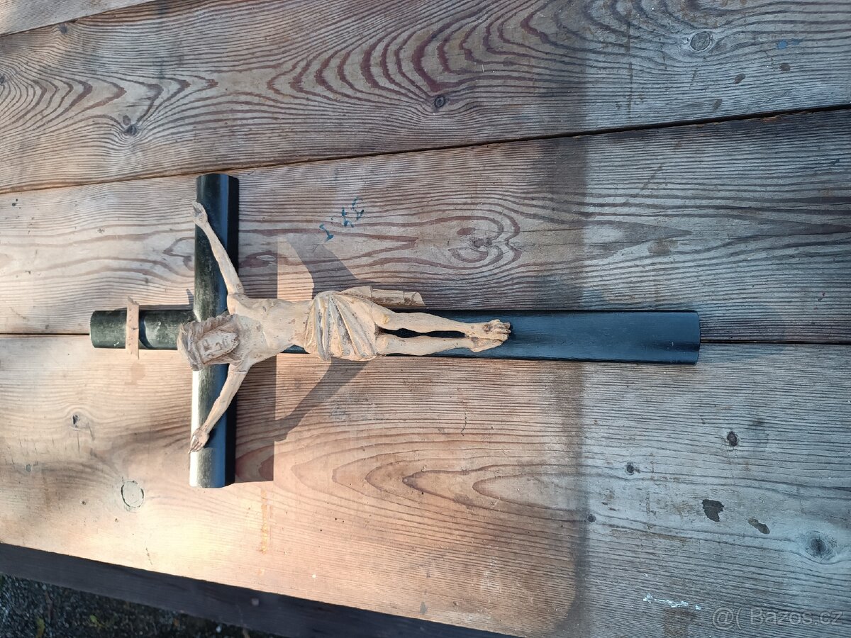 Starý ručně vyřezaný kříž Krista, krucifix. Rozměry 54x28