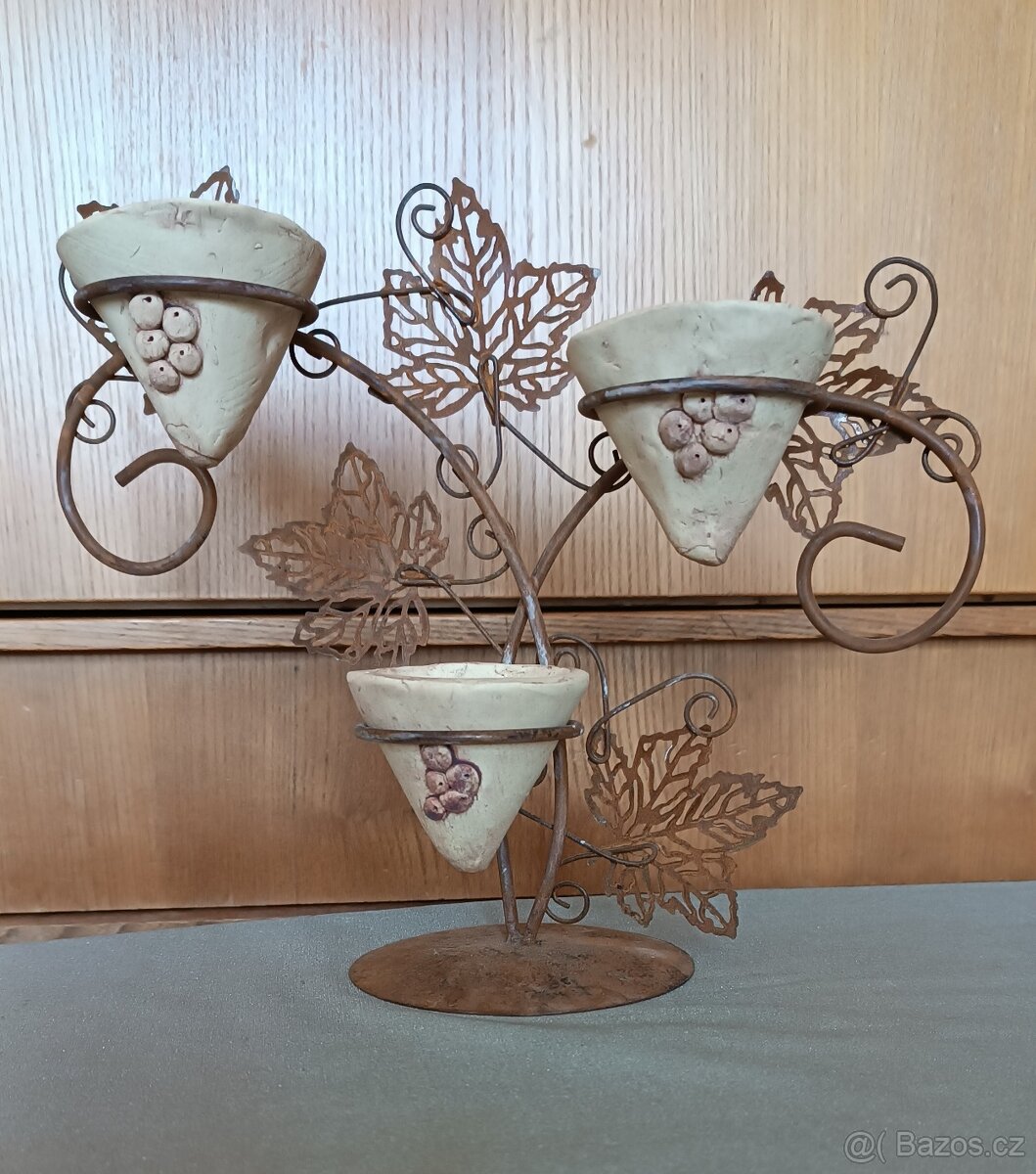 Prodám ozdobný svícen nebo stojan na malé drobnosti s motivem hroznů. Materiál kov a keramika. Rozměr: výška 23 cm, š. 28 cm a hl. 12 cm.
