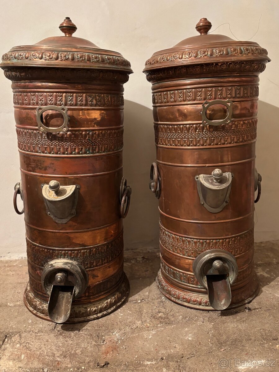 Prodám dvě krásné měděné nádoby bohatě zdobené a kompletní včetně lopatek bez promáčklin. Staré měděné zásobníky na sypké materiály, typicky: