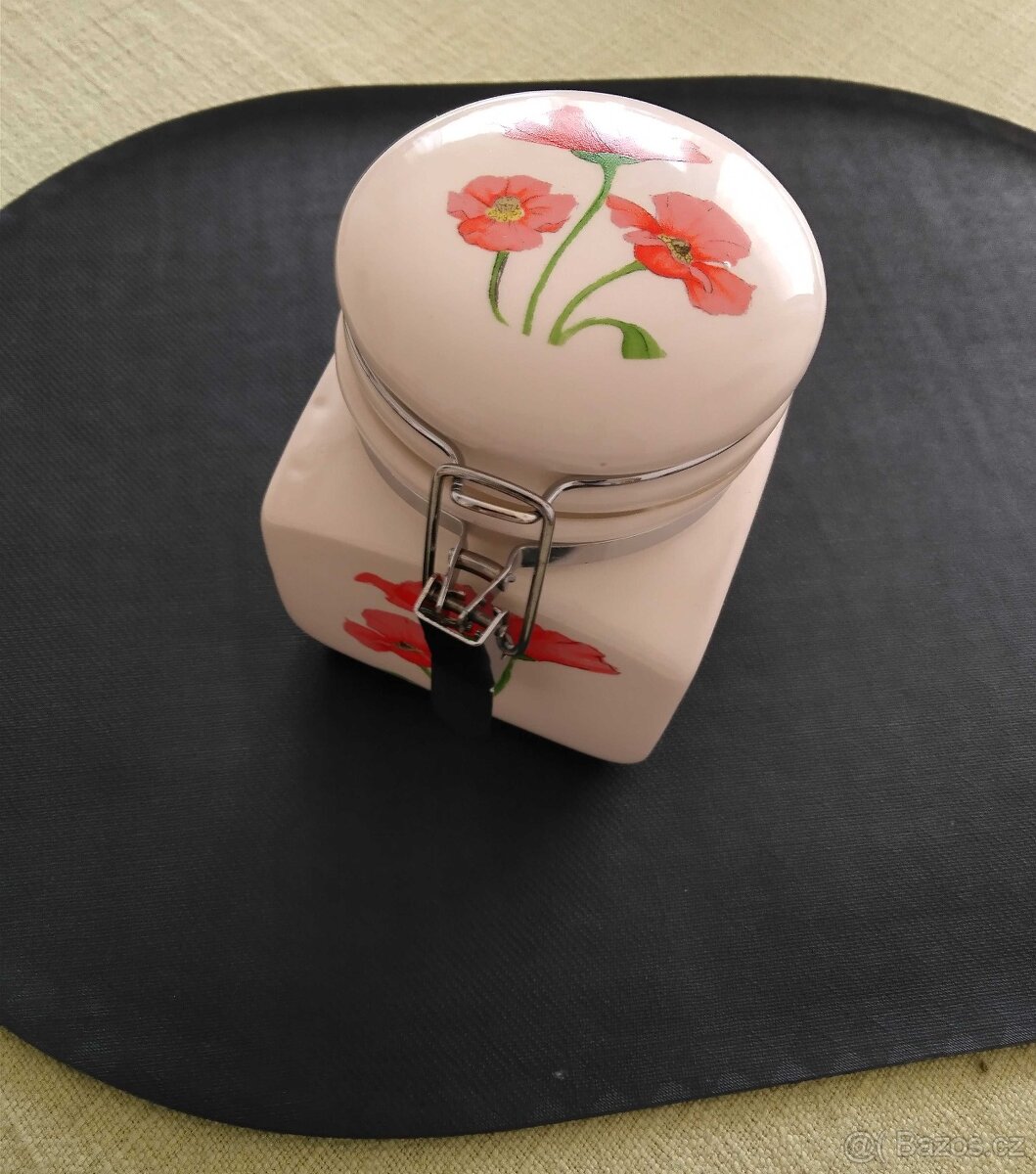 prodám růžovou porcelánovou dózičku s motivem vlčích máků, šíře 8x8 cm, výška 10 cm,