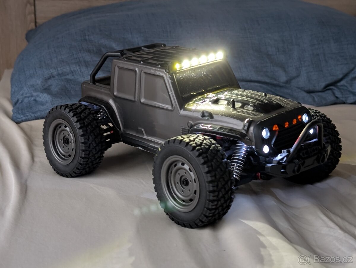 Prodám NOVÝ rychlý RC Jeep na dálkové ovládání. Nejedná se o hračku, ale RC model s pohonem 4x4 v měřítku 1:16 o velikosti cca 30x21x13cm a kompletním plynulým ovládáním plynu a řízení. 2.4Ghz ovladač nabízí plynule nastavitelnou rychlost plynu auta + zapnutí světel. Auto tak lze spomalit např. pro začátečníky či děti ikdyž budou mačkat plný plyn. Maximální rychlost cca 30-40km/h (po zakoupení lepší baterie by mělo jet přes 50km/h.