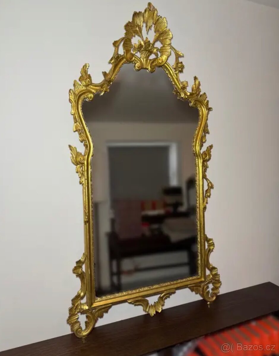 Nabízím krásné starožitné zrcadlo v ručně zdobeném rámu se zlatou povrchovou úpravou. Zrcadlo má výrazné barokní/rokokové prvky, je velmi reprezentativní a hodí se například nad komodu, krb nebo jako dominanta vstupního prostoru či salónu.
