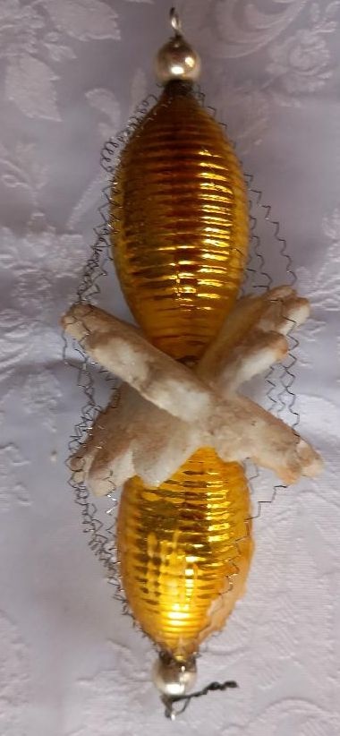 Retro vánoční ozdoba Tanečnice ve žluté barvě měří na výšku 11 cm. Je to foukané sklo v kombinaci s bílou pěnou.