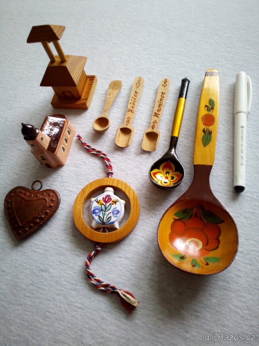 Prodám několik zajímavých drobností. Lžíce jsou dřevěné, kostelík keramický a srdce kovové. Cena za vše 125 Kč.