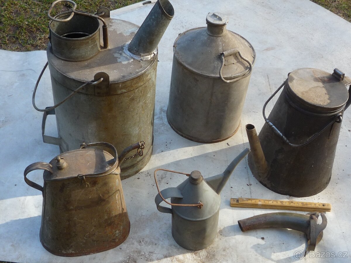 prodám pouzdra od voj.plynových masek. Wehrmacht z II.sv.války..... Další plechová pouzdra ČSR po 400,-Kč až 700,-Kč /vlnitý plech/. Plechový nalévací konvicový kanystr na olej z II.sv.války. Různé kusy. Cena kus od 400 po 600,-Kč. Nic nepropaguji, sběratelská záležitost. Nějaké válečné voj. německé malé dynamo za 400,-Kč. Dva kusy zadní stabilizátory pro vojenské předměty-věci "kontejnery" vyhazované z letadel. Kus 700,-Kč. (Jen ty staré zadní stabilizátorové plechy co jsou na foto.) /Vhodné k využití jako nádoby-krmítka pro zvířata./ Plechové 20 l kanystry na palivo. Ruské po 400,-Kč, německé válečné-Wehr. 1943-900, 1942-1.000,-Kč, anglické válečné po 600,-Kč.