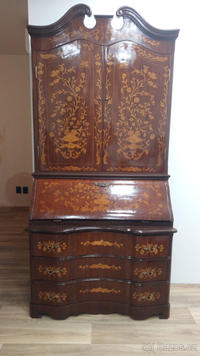 Prodám nádherný starožitný intarzovaný sekretář, kvalitní dřevo, vykládaný, lakovaný, zdobené kovové rukojeti, mnoho šuplíků větších i drobných, otevírací dvířka, provedení se starými panty. Stav velmi dobrý (bez jakýchkoliv problémů). Kvalitní replika z kvalitního dřeva. Pro stěhování se rozkládá na dvě části - horní a spodní (spojeno šrouby). Šířka cca 104 cm (108 cm včetně střední lišty), výška cca 225 cm (včetně horní řezbované části), hloubka ve spodní části cca 48 cm (včetně dřevěného lemování), hloubka v horní části cca 20 cm (horní řezbovaná část cca 22 cm). Koupený nedávno za 33.000 Kč. Stěhujeme se