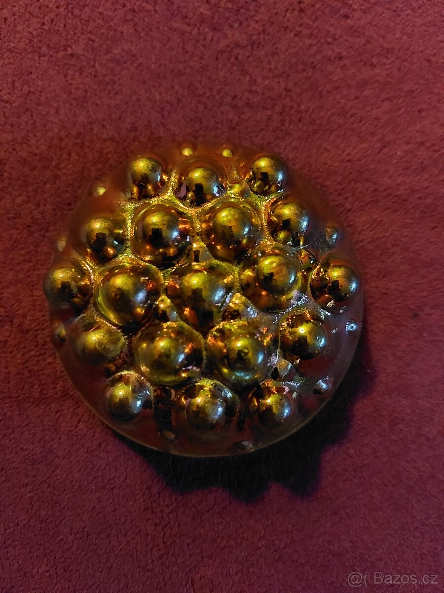 Růžové hutně tvarované a irizované sklo. Originální papírová krabička s nálepkou: Železnobrodské sklo. Designový stolní malý svícen na jednu svíčku ve tvaru formy na bábovku zdobený kombinací leštěné plochy a barevným metalickým listrem. Československo, Železný Brod, 70. až 80. léta minulého století. Výška 3,5 cm, horní průměr 8,5 cm. Rozměr krabičky 9 cm x 5 cm x 5 cm.