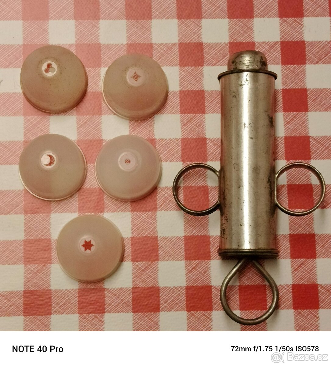 Prodám starou kovovou zdobičku cukroví, 5 lehce vyměnitelných plastových nástavců s různými tvary otvorů pro vytváření rozmanitých tvarů krému.