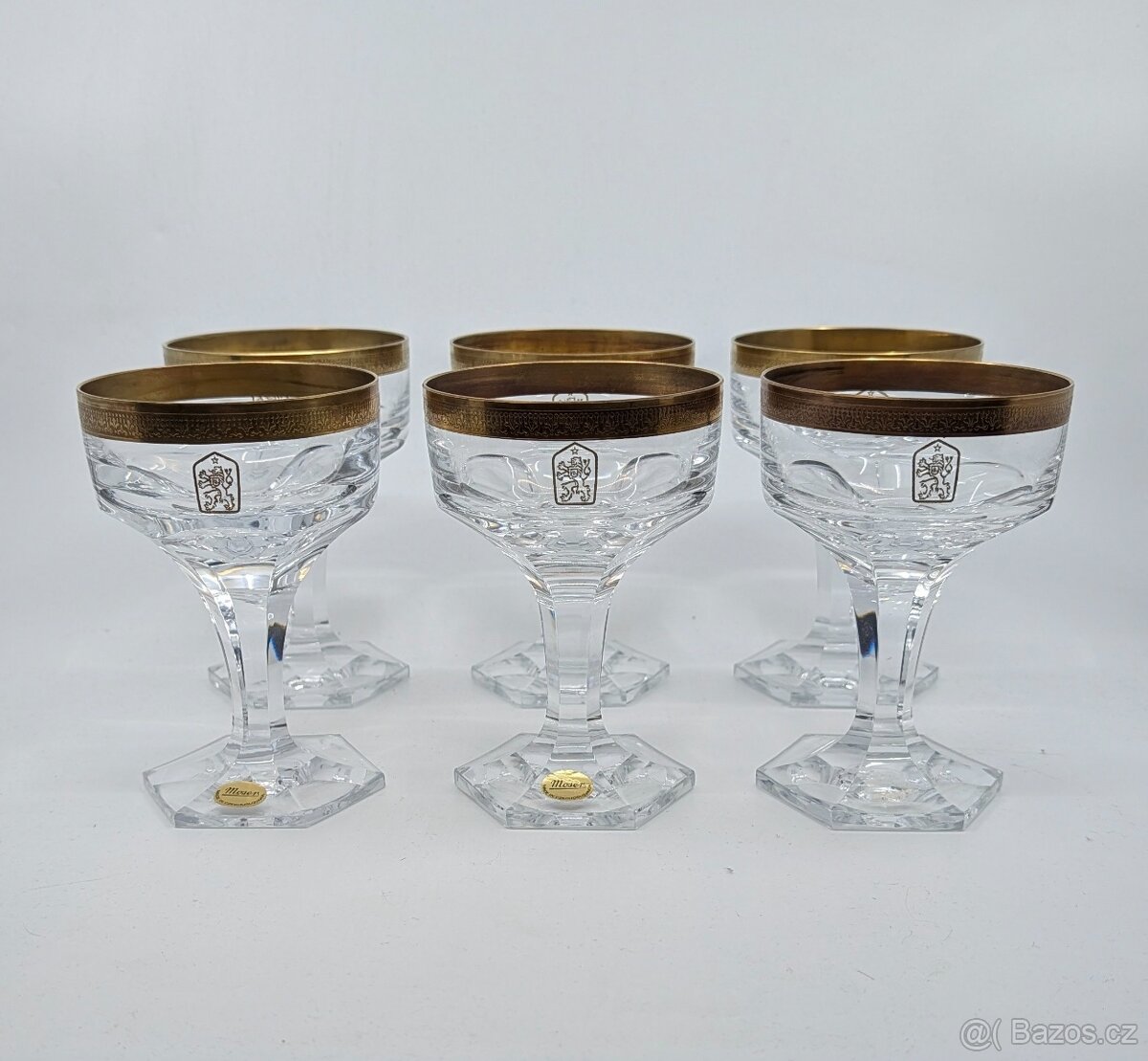 Luxusní ručně broušené skleničky z produkce sklárny Moser, zdobené zlatým pásem a českým státním znakem. Elegantní tvar na vysoké nožce s typickou masivní šestihrannou patou. Vhodné pro slavnostní příl ...