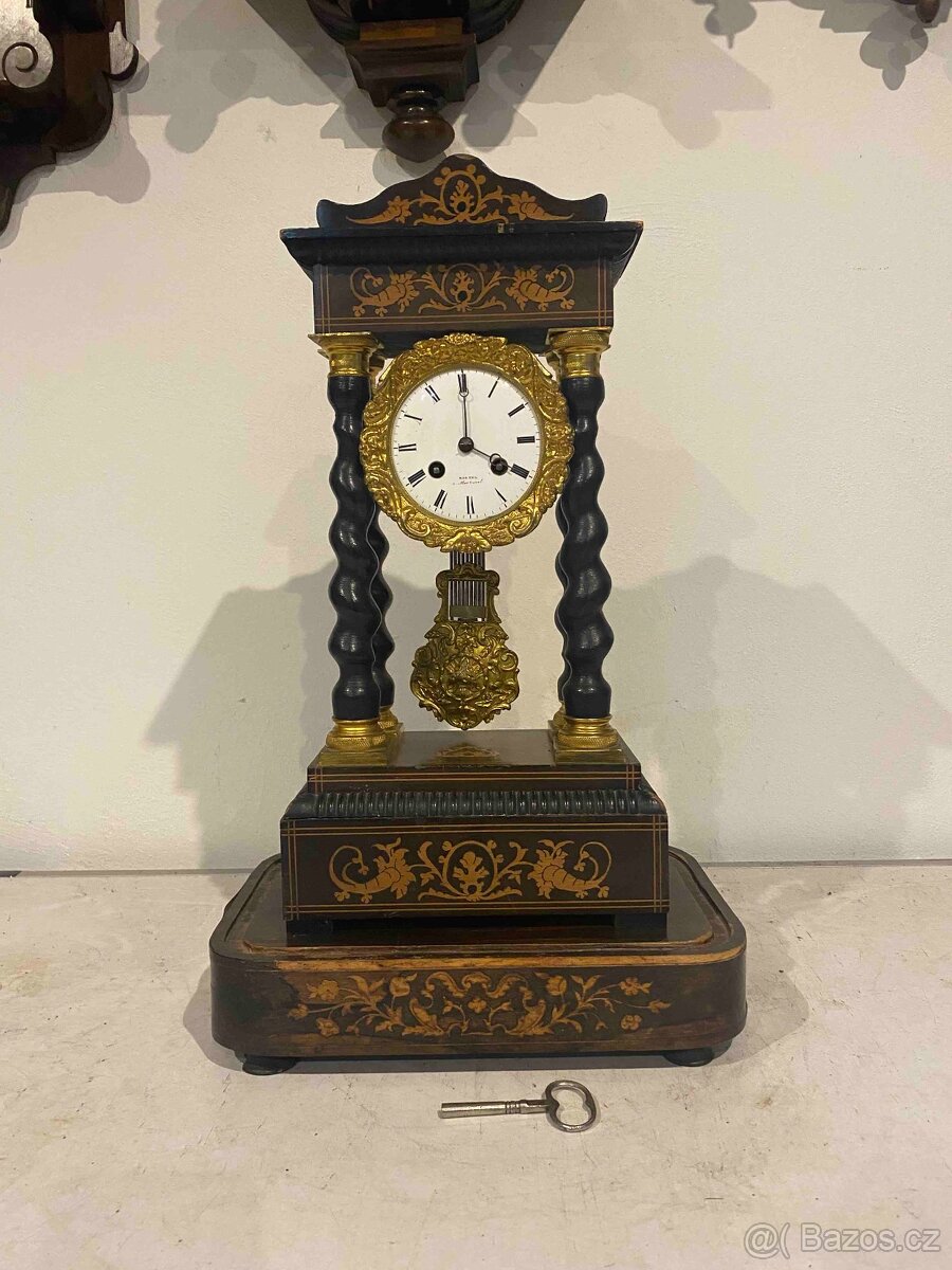 Nabízím nádherné starožitné sloupkové hodiny s mechanickým strojkem, vyrobené ve Francii, kolem roku 1880–1900. Hodiny jsou bohatě zdobené – kombinují zlaté florální ornamenty, černé točené sloupky a klasický bílý ciferník s římskými číslicemi. Funkční