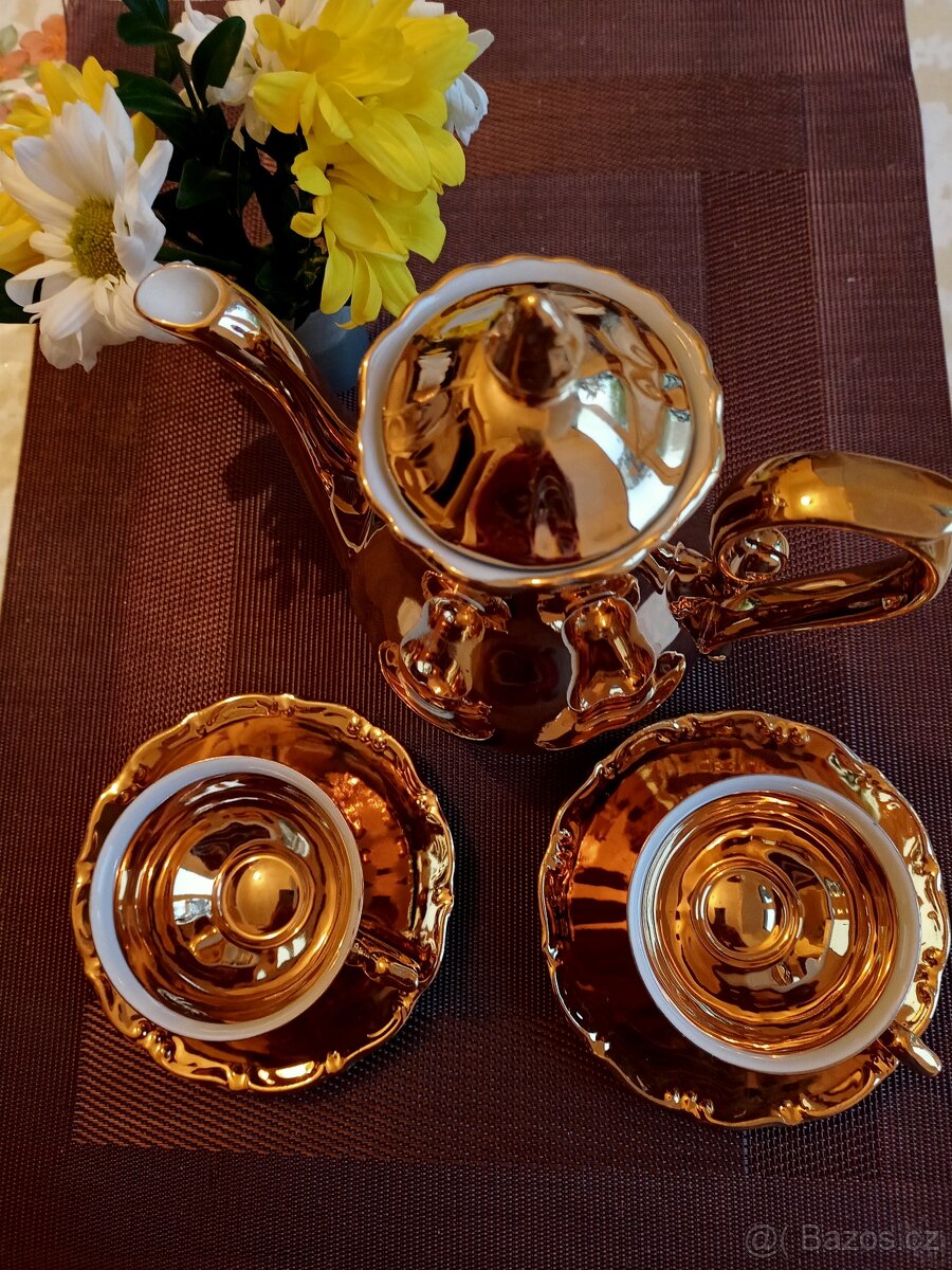 Nabízím tuto nádhernou mocca soupravu, dva šálky, dva podšálky + konvice. Zlatá lesklá,Bez závad.