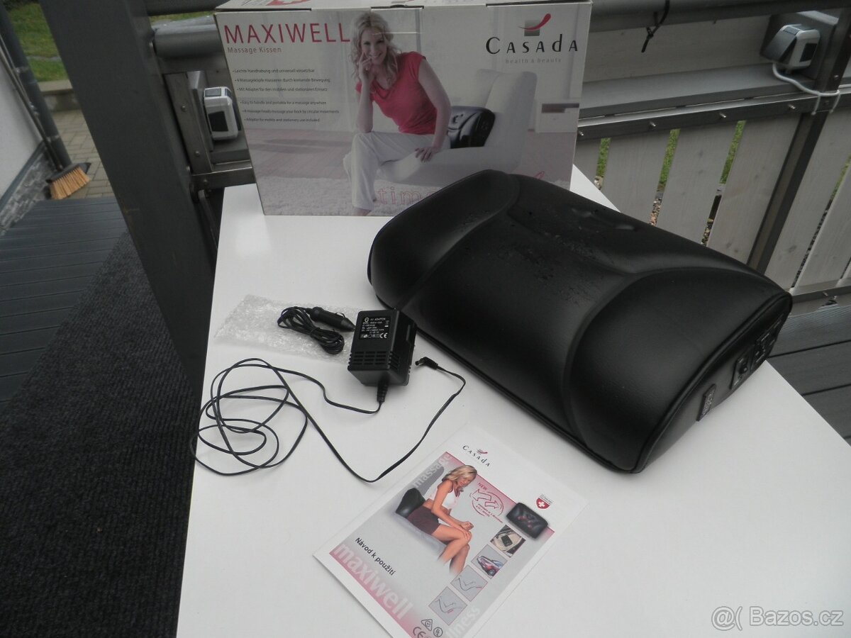 Nabízím k prodeji masážní polštář CASADA německé firmy Maxiwell. Pohon je zajištěn el. adaptérem 220V, případně lze použít i druhý adaptér 12V, je tedy k použití jak v interiéru, tak i autě. Pohyb masážních hlavic lze směřovat ve směru hodin, tak i reverzně a jak v pomalém, tak i rychlém modu. Podrobný popis využití a používání je uveden v přiloženém originálním návodu v německé i anglické verzi, tak i přiloženém originálním návodu v českém jazyce. (viz. přiložené foto). Povrch polštáře je z umělé kůže (kosmetická vada-uprostřed se trochu loupe), ale nemá to vliv na funkčnost.