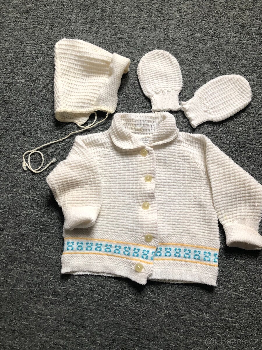 Staré soupravičky, svetříky, čepičky pro miminko a pletená kombinézka. Vše minim 45 let staré.
