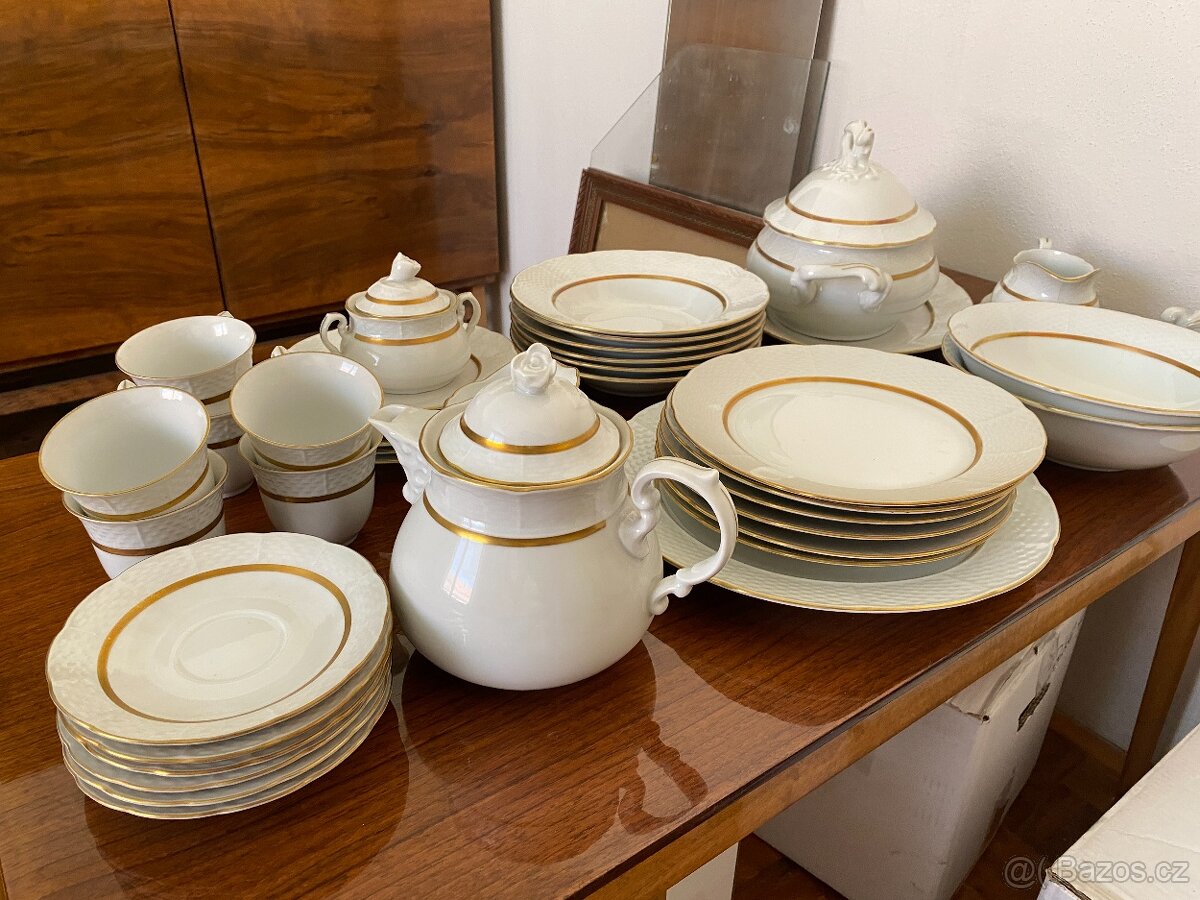 Nabízím k prodeji kompletní, neobouchaný porcelánový servis Thun TK, Menuet, se zlacením. Jedna se o jídelní a čajový servis.