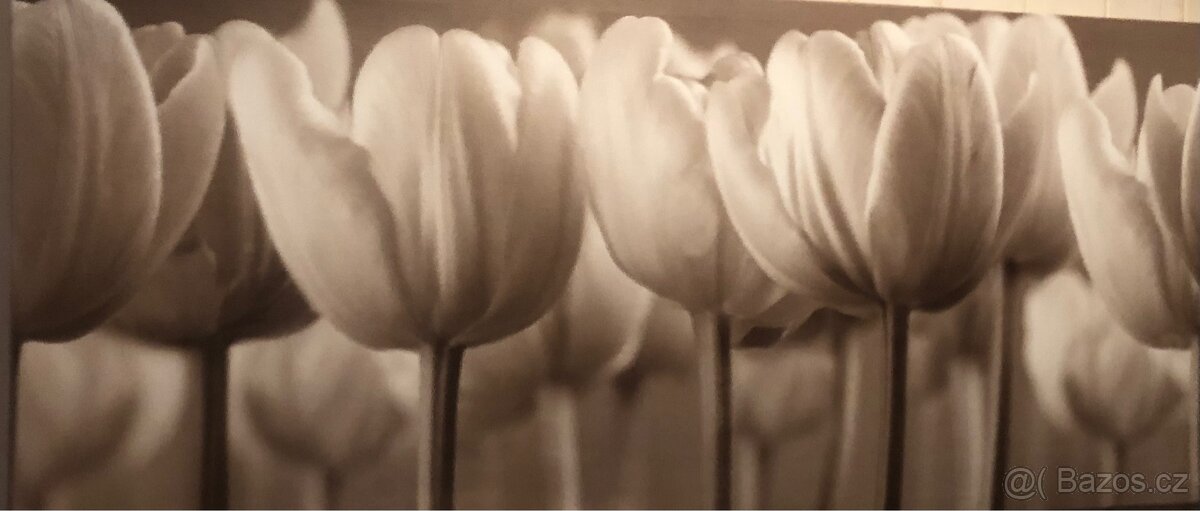 Prodám velkoformátový obraz tulipánů, z Ikea. Rozměry 140 x 56,5 cm. Bez vady. Černobílá fotografie, béžový filtr.