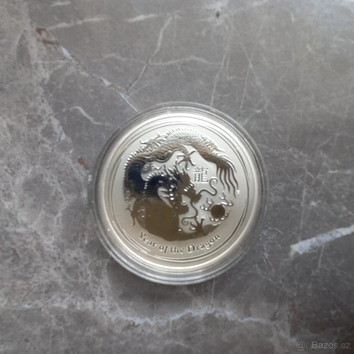 Stříbrná investiční mince 1oz z lunární série II, rok 2012 - drak. Bezvadná, v originální kapsli.
