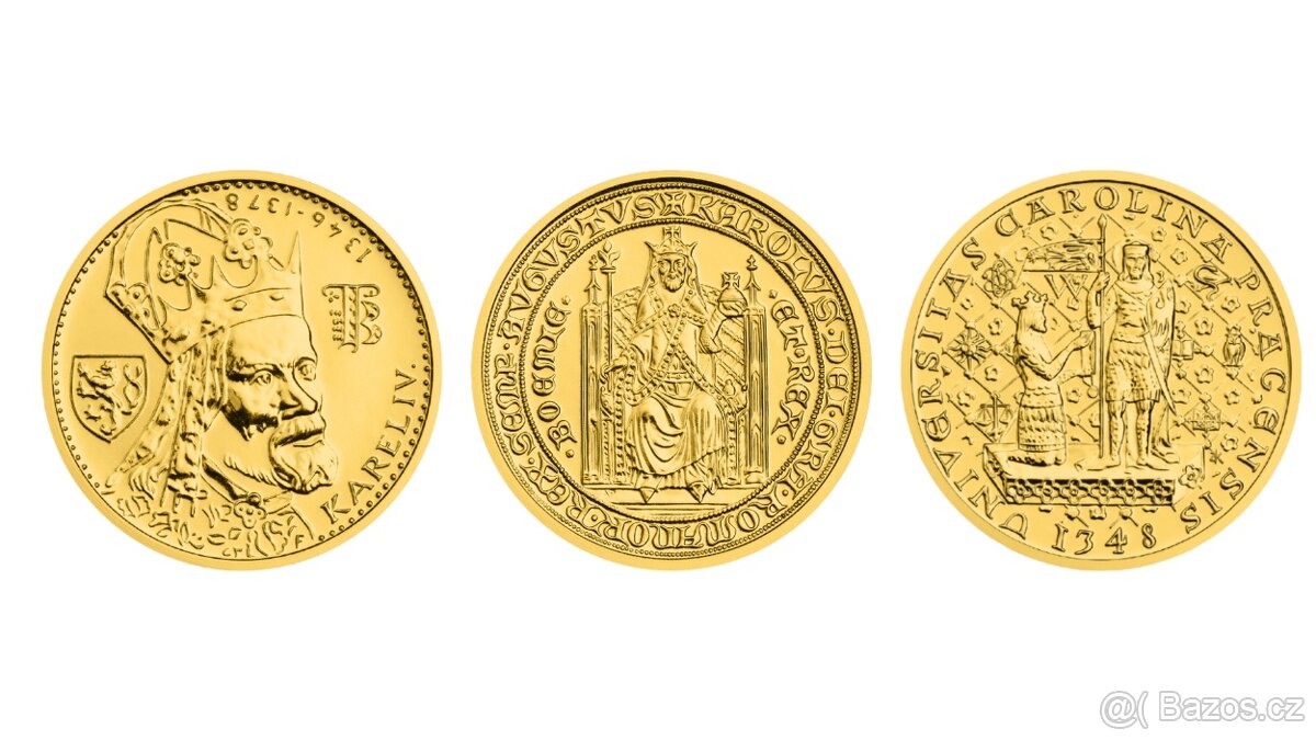 Prodám Karlovské dukáty: 1D, Au 986/1000, 3,49 g, 19,75 mm, raženo 300 ks: 2D, Au 986/1000, 6,98 g, 25 mm, 100 ks: 5D, Au 986/1000, 17,45 g, 34 mm, 100 ks.