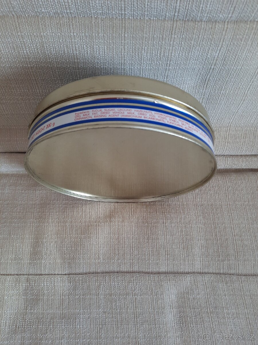 Kulatá plechová krabice, průměr 19,5 cm, výška 5 cm, cena 52,- Kč. Plechová krabička Twinings, výška 9 cm, délka 9 cm, šířka 7 cm, cena 29,- Kč.