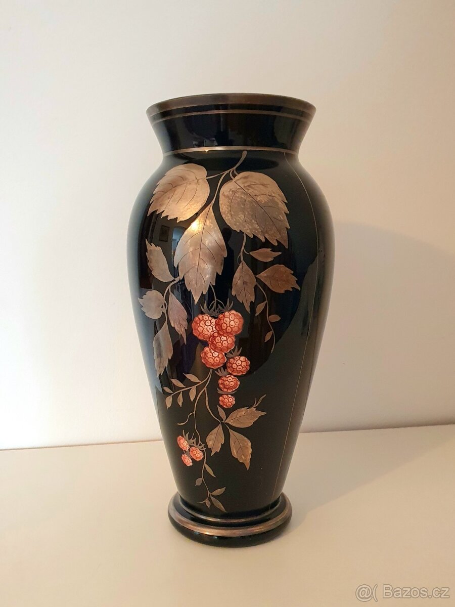 Kamenický Šenov, burelové sklo malované stříbrem a emailem, cca 1920 v:34cm,dno 11cm,hrdlo 12,5 cm