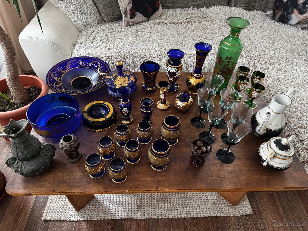 Skleněné nádobí, převážně z kobaltového modrého skla(pozlacené), které je charakteristické svou sytou modrou barvou.Vše nebo jednotlivě,cenu nabídněte.