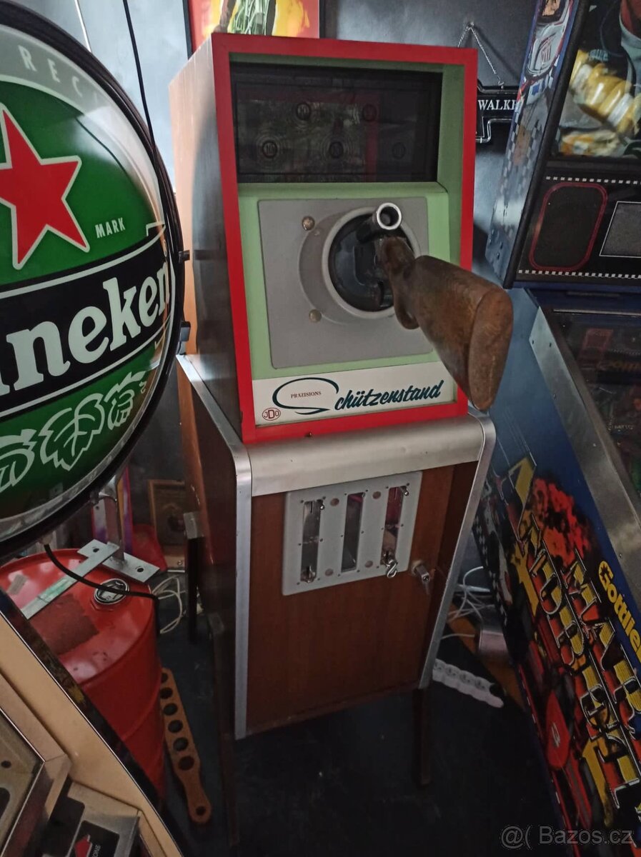 Prodám skvělý arcade automat ze 70. let JDO (střelnice). Plně funkční. V hledí jsou v dálce terče.. po nastřílení 5ti terčů z boku vyjede papírový štítek s výsledkem střelby.