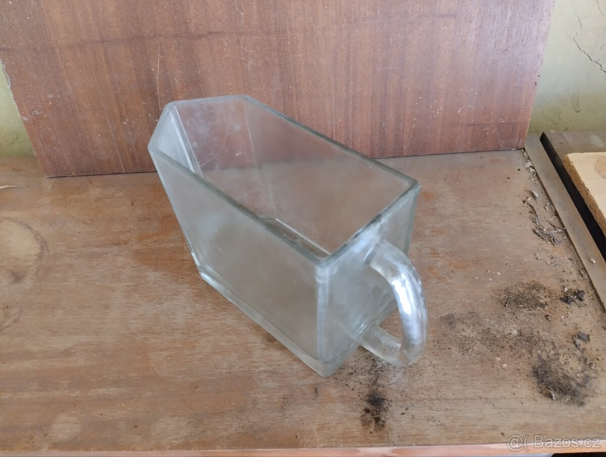 Rozměry: šířka 9cm, hloubka 14,5cm, výška 22cm (po hrdlo), výška (celkem) 26cm. Vnitřní průměr hrdla 7cm.