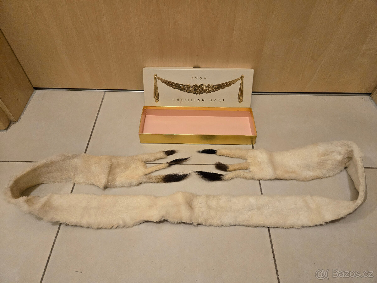 Prodám vintage set: kožešinový šál přes ramena v dobové krabičce Avon Cotillion z období roku 1934.