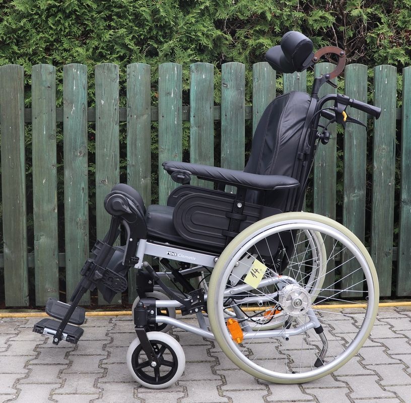 Polohovací invalidní vozík Clematis. Šíře sedu 50 cm. Hloubka sedu 45 cm. Výše zad 53 cm. Celková šíře 73 cm. Přední i zadní kola plná. Náklon zad. Náklon sedačky. Polohovací podnožky. Rychloupínáky. Brzdy pro doprovod.
