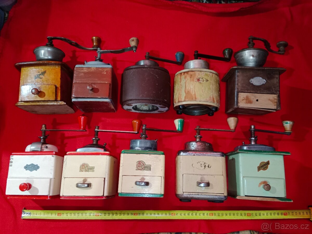 Mlýnky na kávu 18 ks + 2 ks dóz + korbel atd.