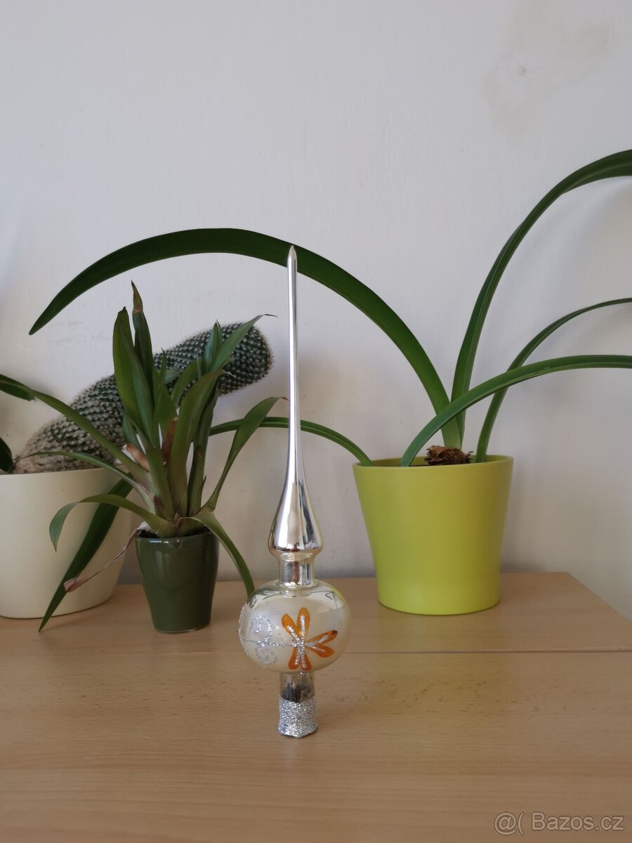V původním balení, skleněná, stříbrné barvy se zlatým a stříbrným zdobením, špička na vánoční stromeček. Od společnosti VÁNOČNÍ OZDOBY družstvo uměl. výroby, Dvůr Králové n.L., výr. č. 74658