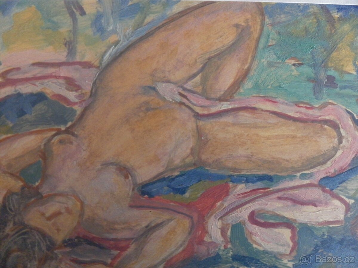 Nabízím krásný obraz: Dívka po koupeli od Karla Chaloupky. Olej na kartonu, podepsán uprostřed pod paspartou.