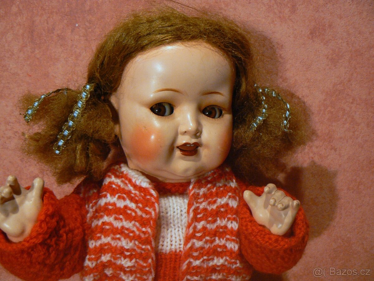 jedinečná stará panenka z období první republiky-velice pěkný- původní stav viz foto-celková výška 54 cm -signována -mrkací- koulející oči, pohybující jazyk, neplačící, pevné gumičky- jedinečný sběratelský klenot