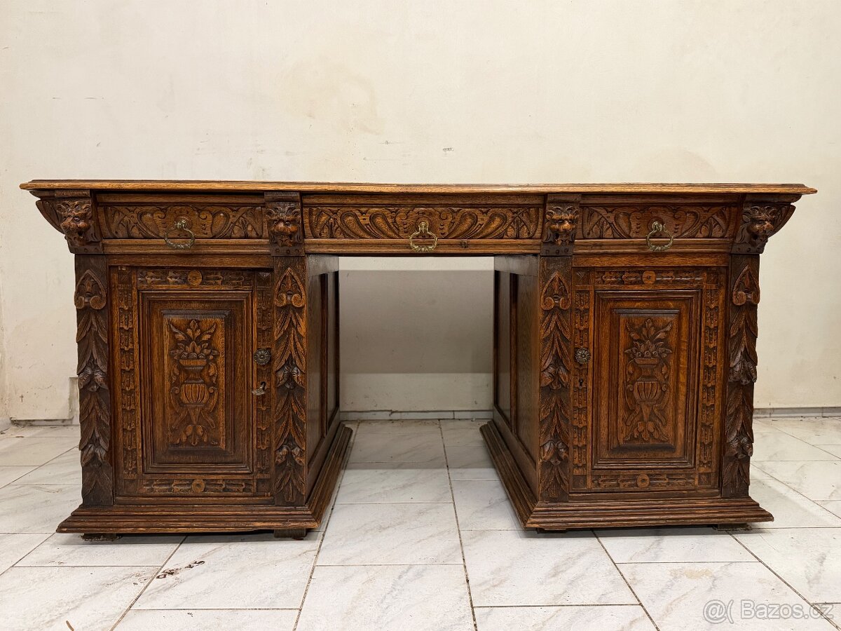 Starožitný pracovní stůl Mechelen ● dubové dřevo ● bohatě zdobený ● stabilní ● historické řezby ● neorenesanční styl ● mosazné kování ● lví hlavy – typické pro mechelen styl ● původ Belgie ● období historimus ● +- 1900 ● 1x klíč ● rozložitelný na 3 části - snadný transport