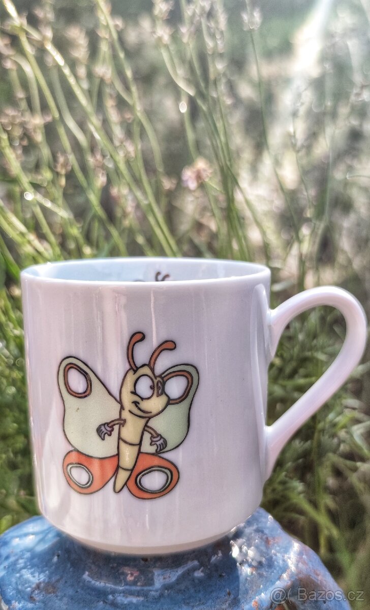 Nabízím krásný starožitný porcelánový hrnek s roztomilým motivem usměvavého motýla. Jedná se o originální kousek s autentickou značkou Original Bohemia s písmenem "D" v korunce, která odkazuje na tradiční českou výrobu porcelánu z Dubí.