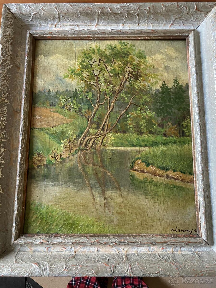 prodám obrazy z pozůstalosti s původními rámy, období kolem roku 1945, možná dříve. Malba je zřejmě Bečva v okolí Oseku nad Bečvou.