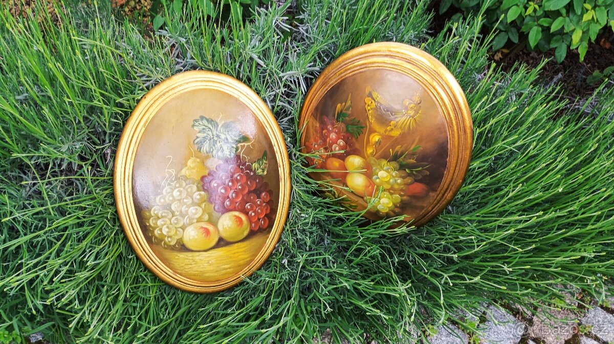 Klasický kulatý obraz celý ze dřeva, 70. léta 20. století. Zátiší, ovoce, olejomalba s rámem z plátkového zlata. Perfektní vintage stav s malými známkami stáří, ale nic zásadního. Celkem dva kusy 750,-/kus