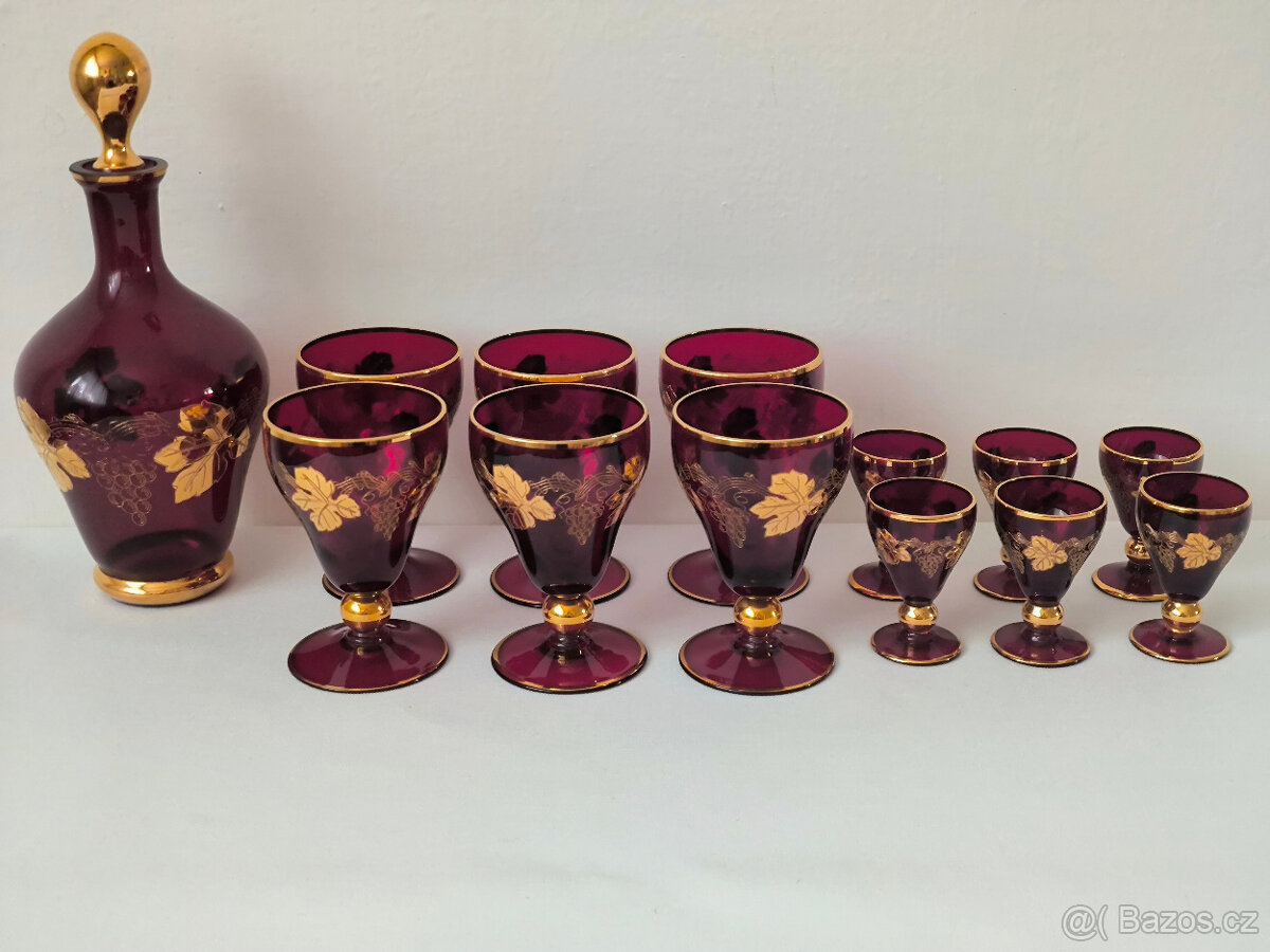 Sada - červená karafa, 6x štamprdle, 6x sklenička 1dcl, Karafa výška 23,5cm, šířka 9,5cm, větší skleničky výška 10,3cm, šířka 6,6cm, menší skl. výška 6,5cm, šířka 4cm