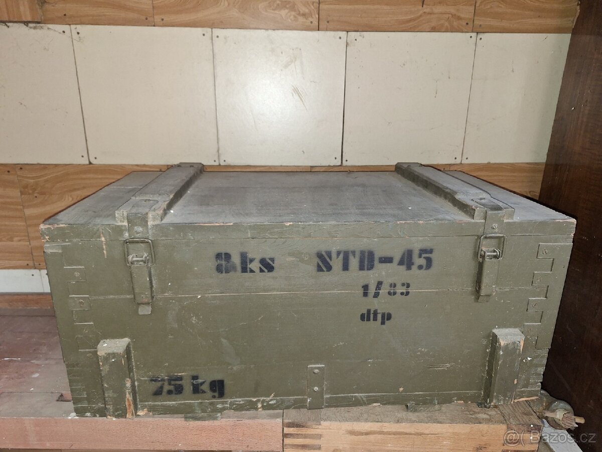 Prodám staré dřevěné vojenské bedny od munice v krásném stavu. Vnější rozměry 40x35x20 cena 200kč a 72x38x34 cena 400kč.