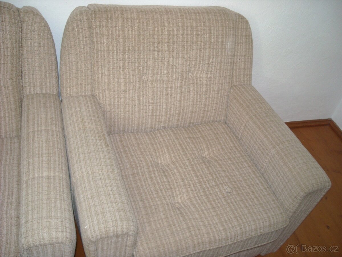Prodám pěknou čalouněnou sedací soupravu vhodnou na chatu, chalupu: 2 křesla (82 cm šířka, 80 cm hloubka a 76 cm výška. Gauč délka 225 cm, při rozložení 140 x 195 cm. Potah je nepoškozený.