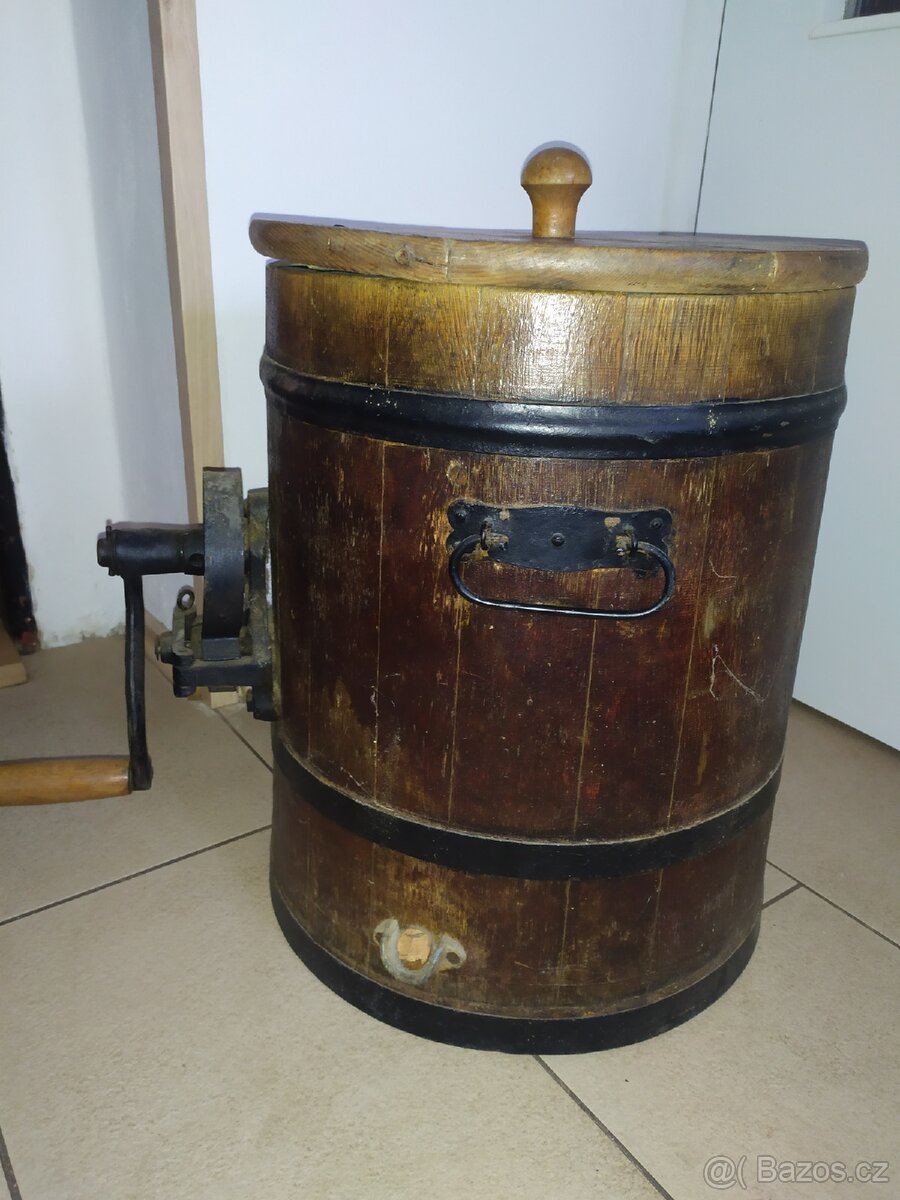 Nabízíme k prodeji tuhle starou dřevěnou nádobu na výrobu másla. Je v dobrém zachovalém stavu, funkční.